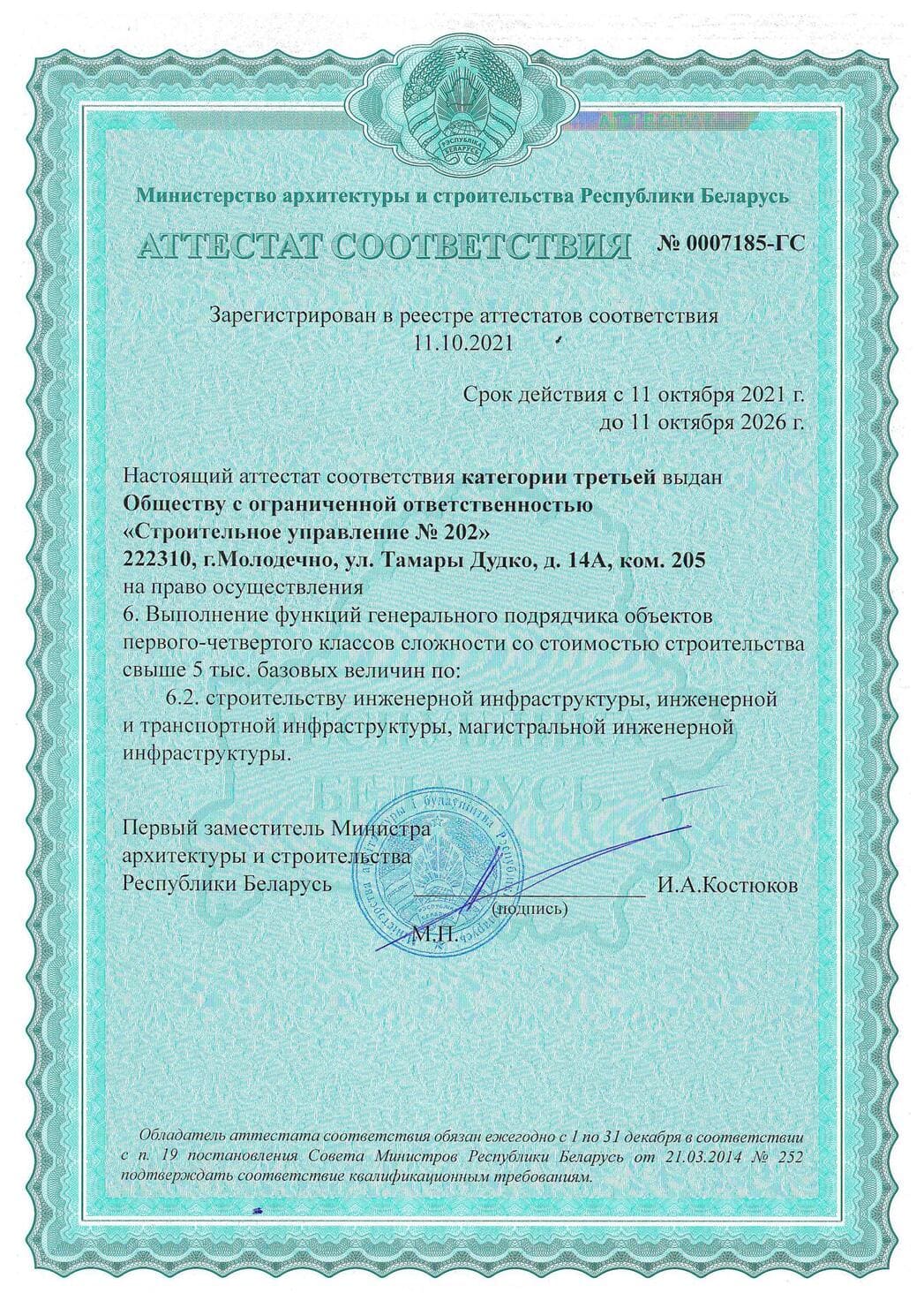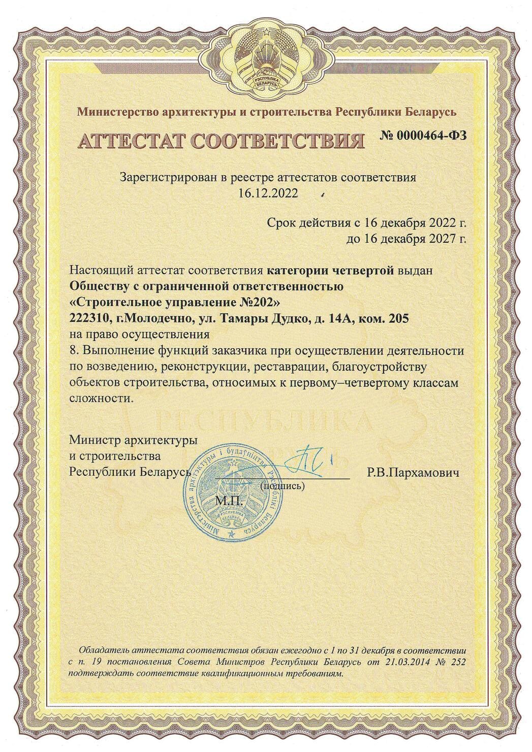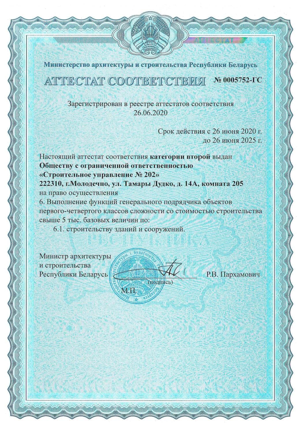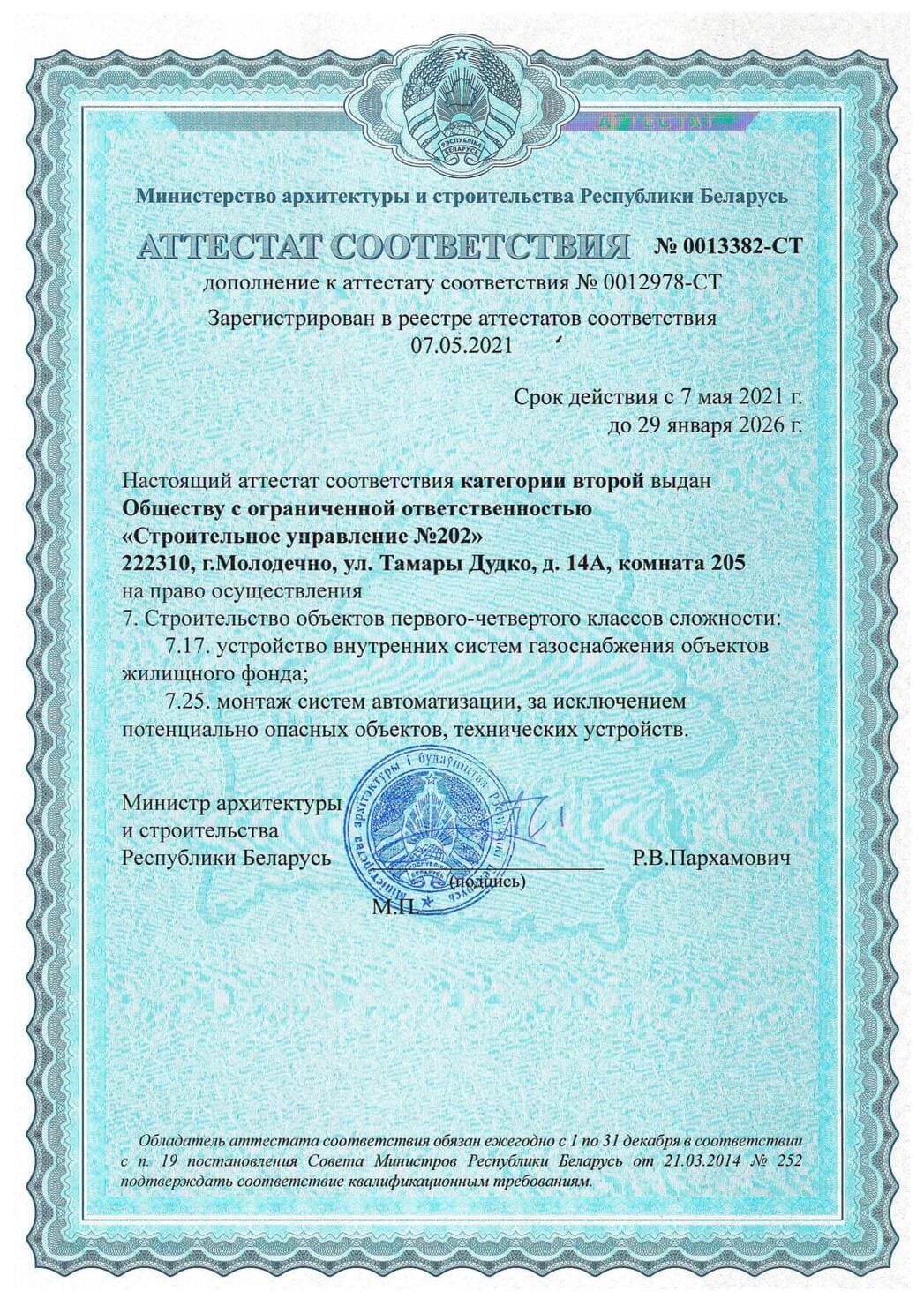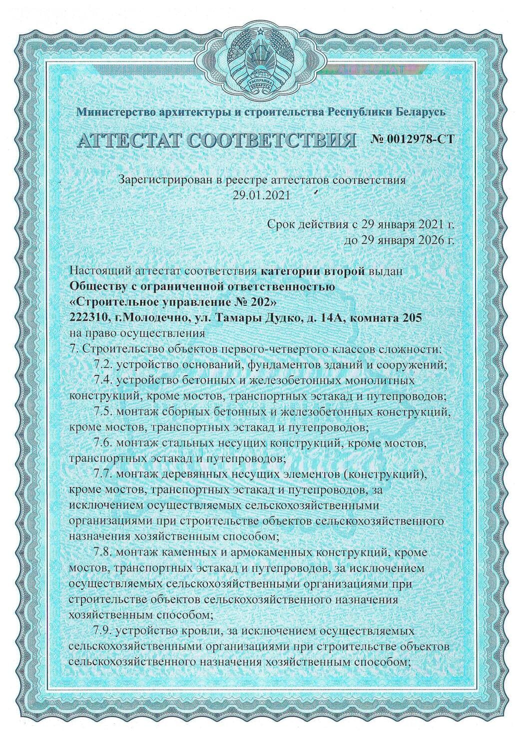Общество с ограниченной ответственностью «Строительное управление № 202» (ООО «СУ № 202») зарегистрировано решением Молодечненского районного исполнительного комитета от 19.10.2012 года в Едином государственном регистре юридических лиц и индивидуальных предпринимателей за № 691502428, УНП 691502428, расположено по адресу: Минская область, г. Молодечно, ул. Тамары Дудко, д. 14А, кабинет 205.